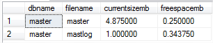 name AS filename,size / 128.0 AS currentsizemb,size / 128.0 - CAST(Fileproperty(name,'SpaceUsed') AS INT) / 128.0 AS freespacembFROM sys.database_files