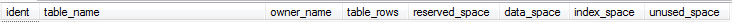 DECLARE @max INT, @min INT, @owner NVARCHAR(256), @table_name NVARCHAR(256), @sql NVARCHAR(4000) DECLARE @table TABLE( ident INT IDENTITY(1,1) PRIMARY KEY, owner_name NVARCHAR(256), table_name NVARCHAR(256)) IF (SELECT OBJECT_ID('tempdb..#results')) IS NOT NULL BEGIN DROP TABLE #results END CREATE TABLE #results( ident INT IDENTITY(1,1) PRIMARY KEY, --Will be used to update the owner. table_name NVARCHAR(256), owner_name NVARCHAR(256), table_rows INT, reserved_space NVARCHAR(55), data_space NVARCHAR(55), index_space NVARCHAR(55), unused_space NVARCHAR(55)) --Loop through statistics for each table. INSERT @table(owner_name, table_name) SELECT su.name, so.name FROM sysobjects so INNER JOIN sysusers su ON so.uid = su.uid WHERE so.xtype = 'U' SELECT @min = 1, @max = (SELECT MAX(ident) FROM @table) WHILE @min <= @max BEGIN SELECT @owner = owner_name, @table_name = table_name FROM @table WHERE ident = @min SELECT @sql = 'EXEC sp_spaceused ''[' + @owner + '].[' + @table_name + ']''' INSERT #results(table_name, table_rows, reserved_space, data_space, index_space, unused_space) EXEC (@sql) UPDATE #results SET owner_name = @owner WHERE ident = (SELECT MAX(ident) FROM #results) SELECT @min = @min + 1 END SELECT * FROM #results order by table_rows