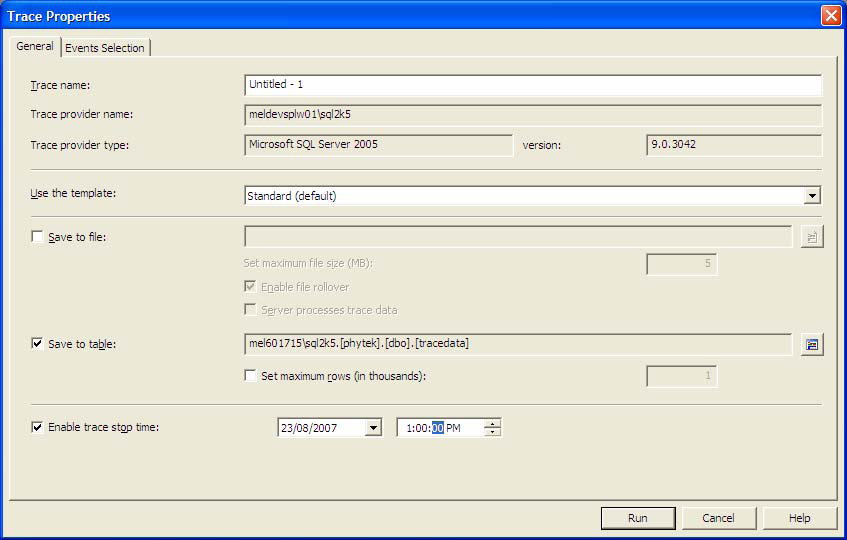 Figure 2 shows the General tab in the same dialog. I have configured the trace to store into a table on a server other than the server I am tracing. I have also configured the trace to stop after an hour.