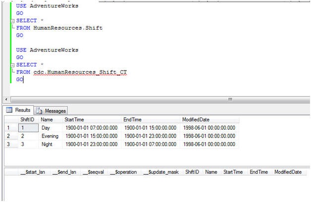 Once the script is run, we will check the content of two of our tables HumanResources.Shift and cdc.HumanResources_Shift_CT.