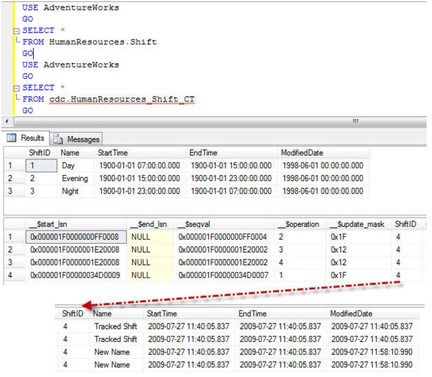 FROM cdc.fn_cdc_get_all_changes_HumanResources_Shift(@begin_lsn,@end_lsn,’all’)