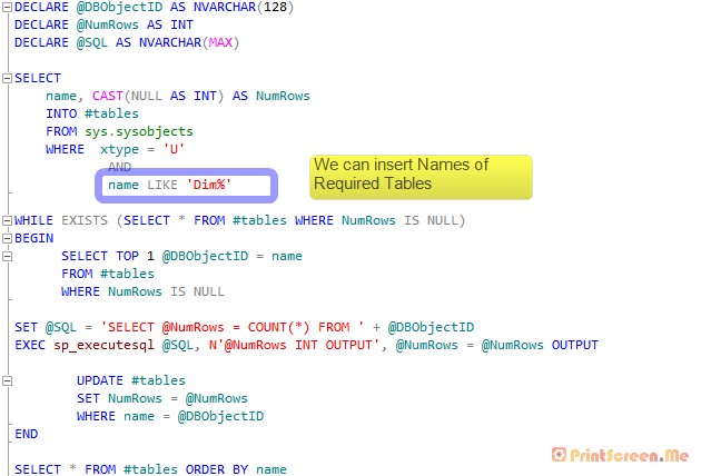 DECLARE @DBObjectID AS NVARCHAR(128) DECLARE @NumRows AS INT DECLARE @SQL AS NVARCHAR(MAX) SELECT name, CAST(NULL AS INT) AS NumRows INTO #tables FROM sys.sysobjects WHERE xtype = 'U' -- AND --name LIKE '<Expected Table names>%' WHILE EXISTS (SELECT * FROM #tables WHERE NumRows IS NULL) BEGIN SELECT TOP 1 @DBObjectID = name FROM #tables WHERE NumRows IS NULL SET @SQL = 'SELECT @NumRows = COUNT(*) FROM ' + @DBObjectID EXEC sp_executesql @SQL, N'@NumRows INT OUTPUT', @NumRows = @NumRows OUTPUT UPDATE #tables SET NumRows = @NumRows WHERE name = @DBObjectID END SELECT * FROM #tables ORDER BY name DROP TABLE #tables