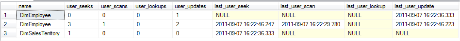 select t.name, user_seeks, user_scans, user_lookups, user_updates, last_user_seek, last_user_scan, last_user_lookup,l ast_user_update from sys.dm_db_index_usage_stats i JOIN sys.tables t ON (t.object_id = i.object_id) where database_id = db_id()