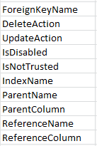 SELECT FK.NAME AS ForeignKeyName ,FK.delete_referential_action_desc AS DeleteAction ,FK.update_referential_action_desc AS UpdateAction ,FK.is_disabled AS IsDisabled ,FK.is_not_trusted AS IsNotTrusted ,IDX.NAME AS IndexName ,PARSCH.NAME + '.' + PAR.NAME AS ParentName ,PARCOL.NAME AS ParentColumn ,REFSCH.NAME + '.' + REF.NAME AS ReferenceName ,REFCOL.NAME AS ReferenceColumn FROM sys.foreign_keys AS FK INNER JOIN sys.foreign_key_columns AS FKC ON FK.object_id = FKC. constraint_object_id INNER JOIN sys.objects AS PAR ON FKC.parent_object_id = PAR. object_id INNER JOIN sys.schemas AS PARSCH ON PAR.schema_id = PARSCH. schema_id LEFT JOIN sys.indexes AS IDX ON FKC.parent_object_id = IDX. object_id AND FK.key_index_id = IDX.index_id INNER JOIN sys.columns AS PARCOL ON FKC.parent_object_id = PARCOL. object_id AND FKC.parent_column_id = PARCOL.column_id INNER JOIN sys.objects AS REF ON FKC.referenced_object_id = REF. object_id INNER JOIN sys.schemas AS REFSCH ON REF.schema_id = REFSCH. schema_id INNER JOIN sys.columns AS REFCOL ON FKC.referenced_object_id = REFCOL.object_id AND FKC.referenced_column_id = REFCOL.column_id ORDER BY ParentName ,ForeignKeyName ,ParentColumn ,ReferenceName ,ReferenceColumn