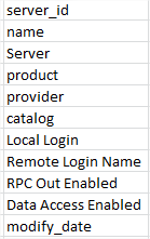 SELECT ss.server_id ,ss.NAME ,'Server ' = CASE ss.Server_id WHEN 0 THEN 'Current Server' ELSE 'Remote Server' END ,ss.product ,ss.provider ,ss.CATALOG ,'Local Login ' = CASE sl.uses_self_credential WHEN 1 THEN 'Uses Self Credentials' ELSE ssp.NAME END ,'Remote Login Name' = sl.remote_name ,'RPC Out Enabled' = CASE ss.is_rpc_out_enabled WHEN 1 THEN 'True' ELSE 'False' END ,'Data Access Enabled' = CASE ss.is_data_access_enabled WHEN 1 THEN 'True' ELSE 'False' END ,ss.modify_date FROM sys.Servers ss LEFT JOIN sys.linked_logins sl ON ss.server_id = sl.server_id LEFT JOIN sys.server_principals ssp ON ssp.principal_id = sl. local_principal_id