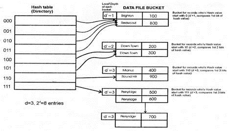 Extendible Hashing: In extendible hashing the stored file has a directory or index table or hash table associated with it. The index table consists of a header containing a value d called the global depth of the table, and a list of 2d pointers [pointers to data block]. Here d is the number of left most bits currently being used to address the index table. The left most d bits of a key, when interpreted as a number give the bucket address in which the desired records are stored.