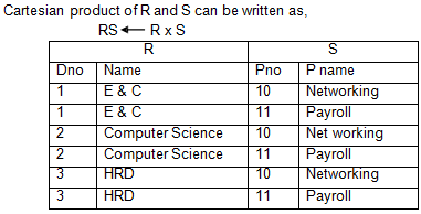 The Cartesian product or cross-product is a binary operation that is used to combine two relations. Assuming R & S as relations with n and m attributes respectively, the Cartesian products R x S can be written as,