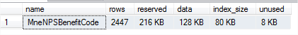 ALTER TABLE npsben.MneNPSBenefitCode REBUILD WITH (DATA_COMPRESSION = PAGE); GO EXEC sp_spaceused 'npsben.MneNPSBenefitCode' GO