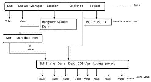 In the first level the DEPARTMENT has a tuple structure with six attributes (Dno, Dname, Manager, Location, Employee, and Project). You can observe that out of these attributes Dno and Dname have basic values; the other four have complex structure. Therefore you need to build second level of the complex object structure. You can also observe that out of these four Manager and Employee has tuple structure and the other two (Location, Projects) have set attributes. For the third level the manager has one basic attribute for start_date_exec and Mgr is a attribute which refers to employee object and has a tuple structure. For Location and Projects we have set of tuple structured objects.