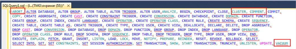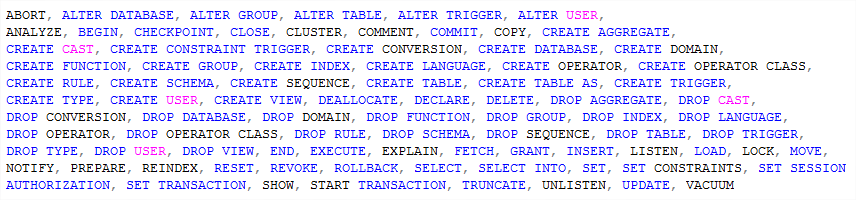 ABORT, ALTER DATABASE, ALTER GROUP, ALTER TABLE, ALTER TRIGGER, ALTER USER,ANALYZE, BEGIN, CHECKPOINT, CLOSE, CLUSTER, COMMENT, COMMIT, COPY, CREATE AGGREGATE, CREATE CAST, CREATE CONSTRAINT TRIGGER, CREATE CONVERSION, CREATE DATABASE, CREATE DOMAIN, CREATE FUNCTION, CREATE GROUP, CREATE INDEX, CREATE LANGUAGE, CREATE OPERATOR, CREATE OPERATOR CLASS, CREATE RULE, CREATE SCHEMA, CREATE SEQUENCE, CREATE TABLE, CREATE TABLE AS, CREATE TRIGGER, CREATE TYPE, CREATE USER, CREATE VIEW, DEALLOCATE, DECLARE, DELETE, DROP AGGREGATE, DROP CAST, DROP CONVERSION, DROP DATABASE, DROP DOMAIN, DROP FUNCTION, DROP GROUP, DROP INDEX, DROP LANGUAGE, DROP OPERATOR, DROP OPERATOR CLASS, DROP RULE, DROP SCHEMA, DROP SEQUENCE, DROP TABLE, DROP TRIGGER, DROP TYPE, DROP USER, DROP VIEW, END, EXECUTE, EXPLAIN, FETCH, GRANT, INSERT, LISTEN, LOAD, LOCK, MOVE, NOTIFY, PREPARE, REINDEX, RESET, REVOKE, ROLLBACK, SELECT, SELECT INTO, SET, SET CONSTRAINTS, SET SESSION AUTHORIZATION, SET TRANSACTION, SHOW, START TRANSACTION, TRUNCATE, UNLISTEN, UPDATE, VACUUM