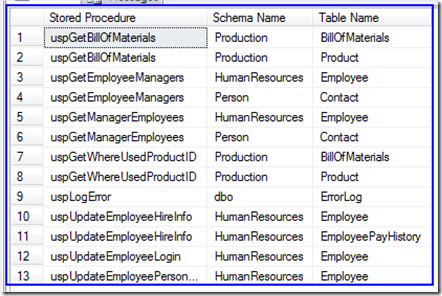 Which shows output as in which stored procedure and which table have been used interns of table – Stored procedure relation