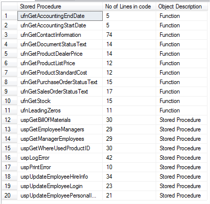 --Total No of line of Code per Object --No of line of code in each object SELECT t.sp_name AS 'Stored Procedure', SUM(t.lines_of_code) - 1 AS 'No of Lines in code ', t.type_desc AS 'Object Description' FROM ( SELECT o.name AS sp_name, (LEN(c.text) - LEN(REPLACE(c.text, CHAR(10), ''))) AS lines_of_code, CASE WHEN o.xtype = 'P' THEN 'Stored Procedure' WHEN o.xtype IN ('FN', 'IF', 'TF') THEN 'Function' END AS type_desc FROM sysobjects o INNER JOIN syscomments c ON c.id = o.id WHERE o.xtype IN ('P', 'FN', 'IF', 'TF') AND o.category = 0 AND o.name NOT IN ('fn_diagramobjects', 'sp_alterdiagram', 'sp_creatediagram', 'sp_dropdiagram', 'sp_helpdiagramdefinition', 'sp_helpdiagrams', 'sp_renamediagram', 'sp_upgraddiagrams', 'sysdiagrams') ) t GROUP BY t.sp_name, t.type_desc ORDER BY 1