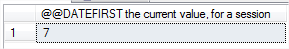 SELECT @@DATEFIRST AS '@@DATEFIRST the current value, for a session'
