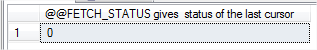 SELECT @@FETCH_STATUS AS ‘@@FETCH_STATUS gives status of the last cursor’