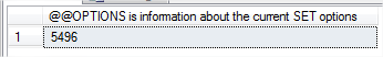 SELECT @@OPTIONS AS '@@OPTIONS is information about the current SET options'