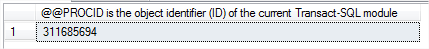 SELECT @@PROCID AS '@@PROCID is the object identifier (ID) of the current Transact-SQL module'